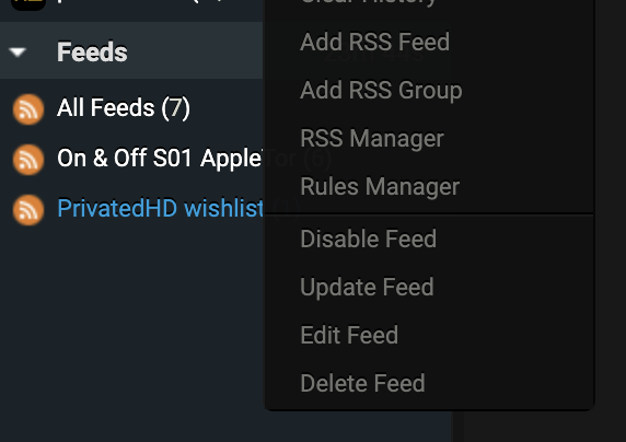 那新添加的 Feed 会自动出现在 Feeds 板块。在 Feed 板块中可以点击查看到 Feed 中的内容。但是这个时候 Feed 中的内容不会自动下载。如果需要配置自动下载需要使用下面的 RSS Manager(或者也被称为 Download Manager)。
