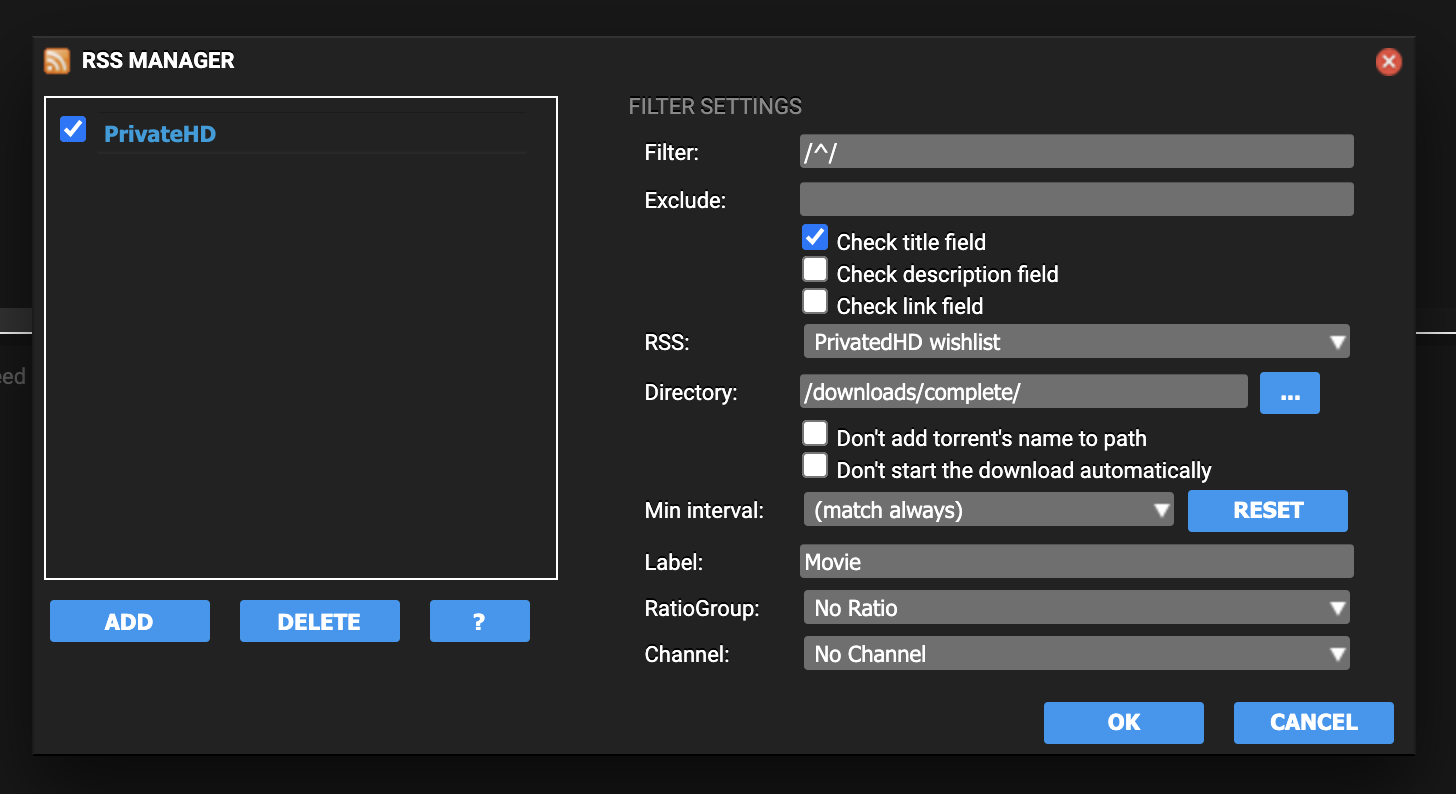 这也使得在 Private Tracker 中使用 RSS 变得非常的容易,大部分的站点都是提供个人的 RSS feed 流的,我使用的 AvistaZ, PrivateHD,都是可以通过关键字订阅来生成自定义的 Feed 流的。